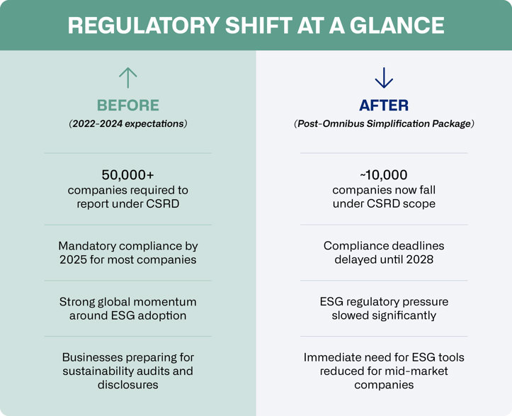 The sustainability reporting landscape has changed significantly in just a short time. In early 2025, the European Union adopted the Omnibus Simplification Package, which scaled back the scope of the Corporate Sustainability Reporting Directive (CSRD).