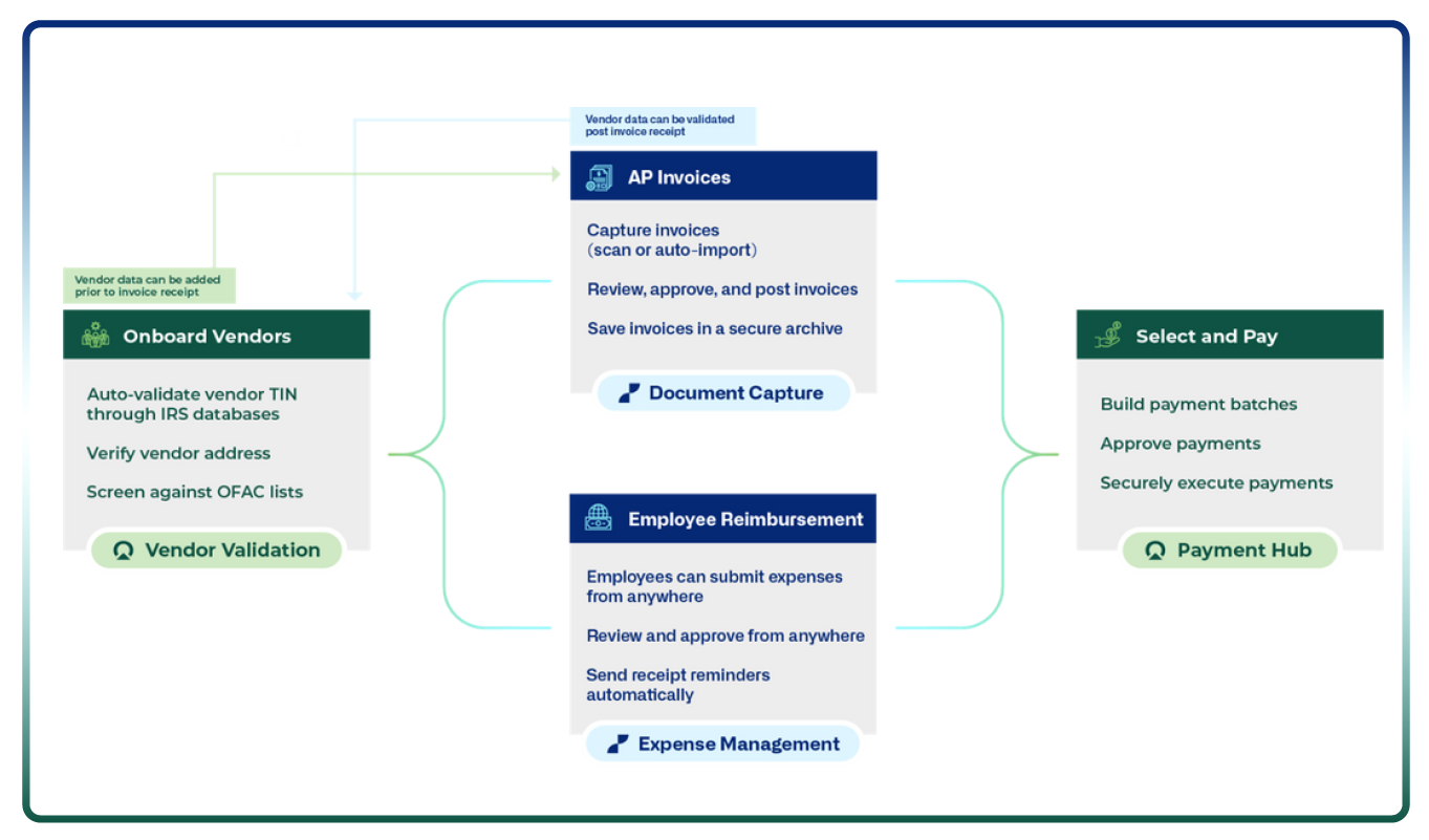 • Pay vendors via ACH, check, virtual card, and more
